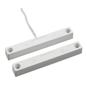 Contacto magnético para puertas y ventanas en sistemas de intrusión.